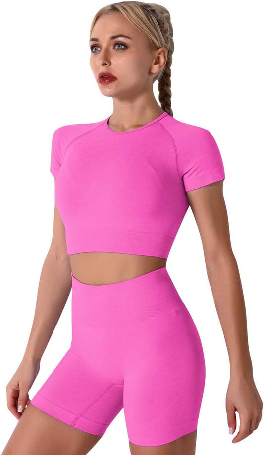 Women Seamless Yoga Outfits 2 Piece Workout Short Sleeve Crop Top with High Waisted Running Short...
